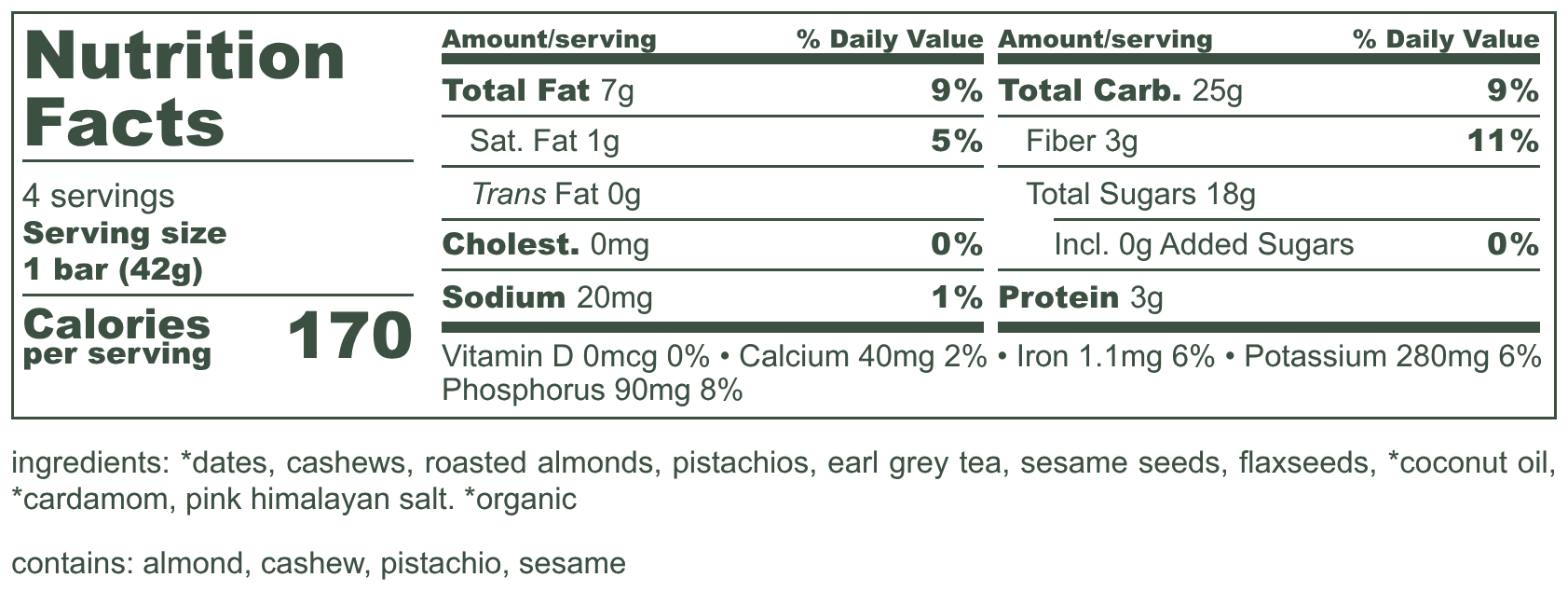 Elevate your snack time with the elegant, aromatic flavors of the Earl Grey Delight SEEDBAR™. Infused with fragrant bergamot and warm cardamom, this bar is crafted with soft, chewy organic dates for a naturally sweet and satisfying experience. Enjoy it on its own or paired with a soothing cup of tea—it’s the perfect companion for a moment of calm.