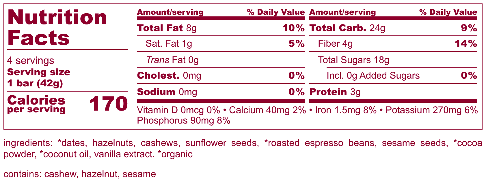 Coffee lovers, this one’s for you! Our Hazelnut Mocha SEEDBAR™ blends crunchy espresso bits with toasted hazelnuts for a bold and nutty flavor experience. Made with organic coffee and soft, chewy dates, enjoy a delicious snack with a gentle caffeine boost. Whether you're tackling a workout or enjoying a midday pick-me-up, this bar is pure indulgence.
