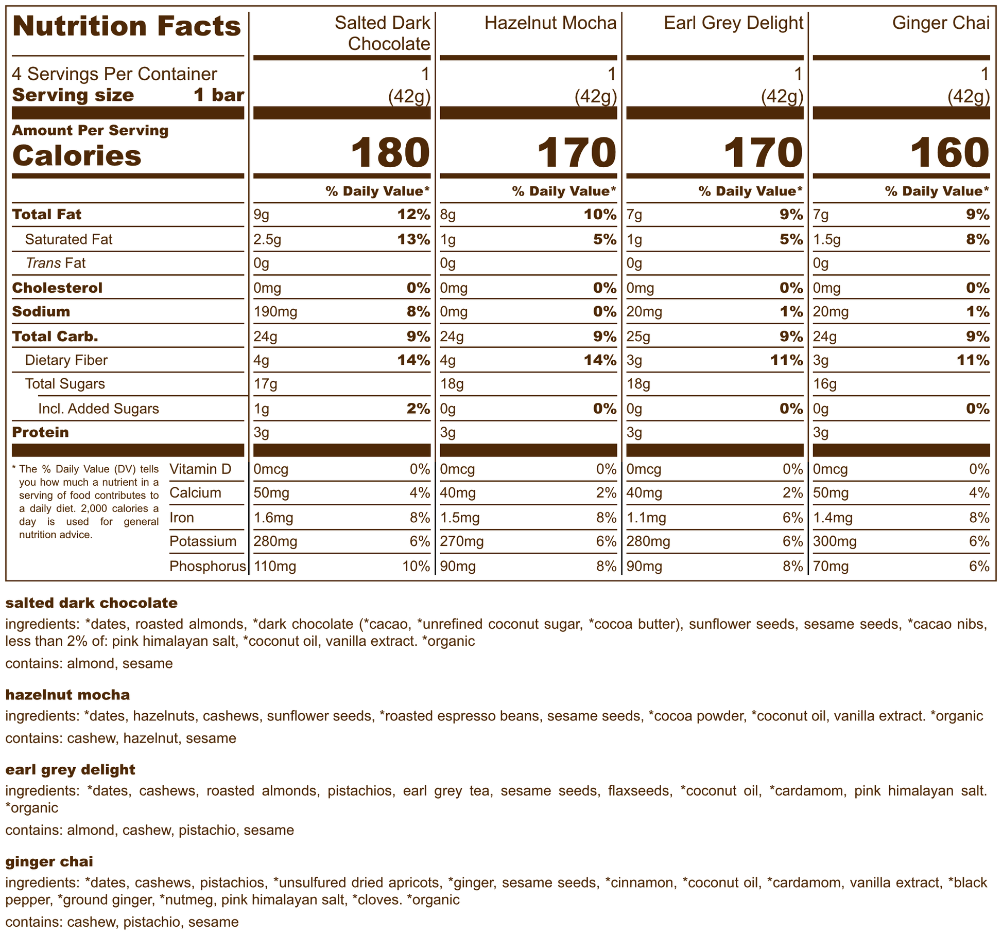 Four individually wrapped bars in Salted Dark Chocolate, Hazelnut Mocha, Ginger Chai, and Earl Grey Delight. Warning: Sharing our all-natural, tasty bars won't be easy! Better buy at least two.